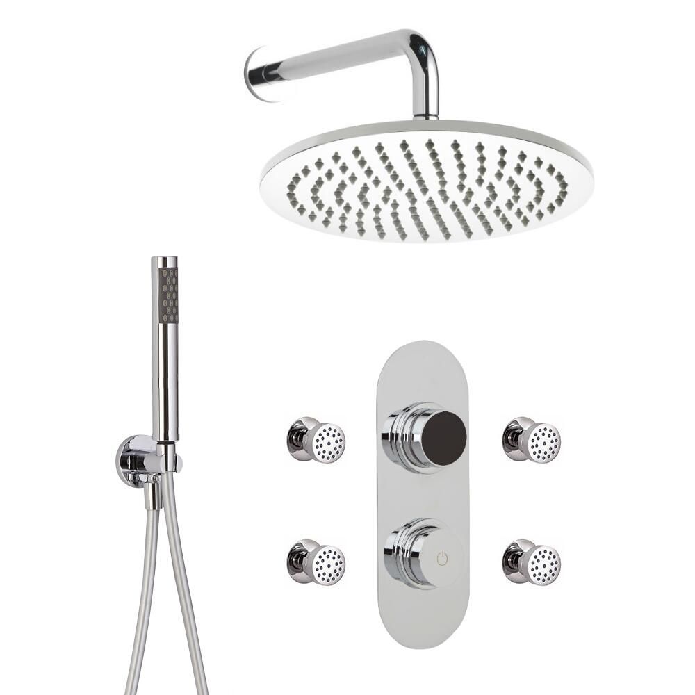 Met behulp van dit 3-weg digitale thermostatische inbouw douchesysteem incl d.30cm regendouchekop, bodyjets en handdouche combinatie wordt je elke dag ongetwijfeld heerlijk onstspannen wakker! Dit 3 weg digitale douchesysteem zet je gemakkelijk aan en uit door middel van 1 druk op de knop en je past de temperatuur aan door eenvoudig aan de knop te draaien. De douchekraan heeft een ingebouwde omstelkraan waar je mee omschakelt van douchekop naar handdouche en bodyjets. De douchekraan heeft tevens een kleurwisselindicator voor de temperatuur.