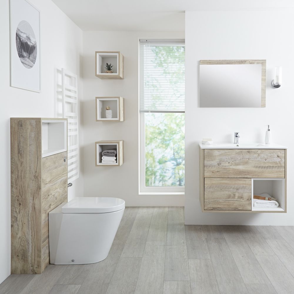 Met een lichte eikenhouten afwerking word het badkamermeubel en het toilet meubel inclusief toilet voorgemonteerd geleverd om de installatietijd te verkorten. Het hangende badkamermeubel heeft veel opbergruimte voor toiletartikelen en schoonheidsproducten, terwijl het toiletmeubel de stortbak en het pijpwerk verbergt voor een nettere afwerking en gemakkelijkere schoonmaak beurt. . Het toilet en stortbak worden meegeleverd. Let op: kraan en afvoer niet inbegrepen.