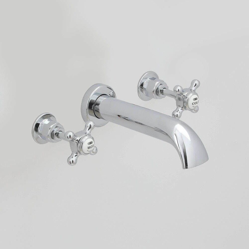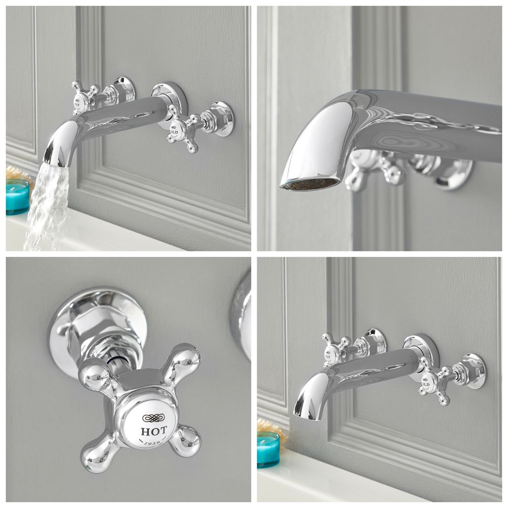 Deze mooi ontworpen Elizabeth muurbevestigde badmengkraan met kruiskop handvaten voegt een stijlvolle klassieke look toe aan elke badkamer.