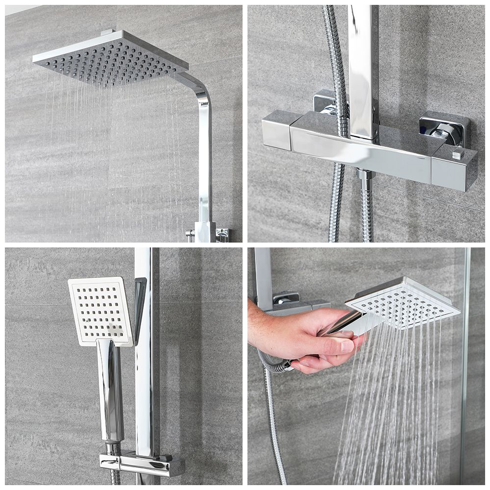 Creëer een moderne designerlook en geniet van douchen in stijl met deze Kubix thermostatische douchekolom, met douchekraan, vierkante douchekop en handdouche.
