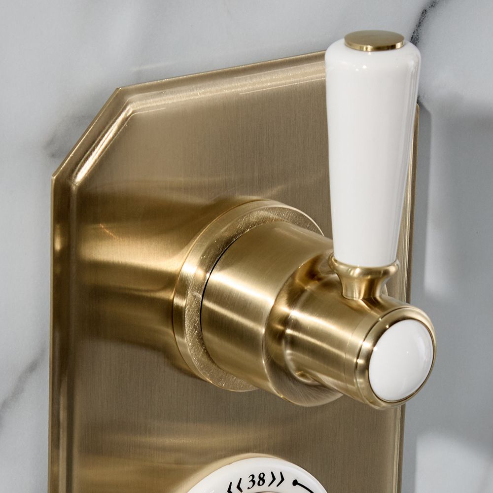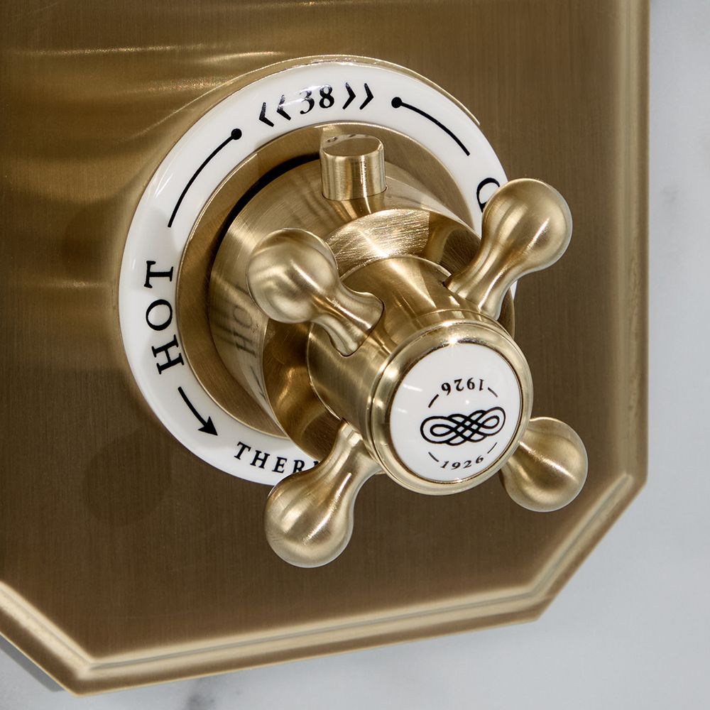 De Elizabeth 1-weg thermostatische douchekraan heeft een elegante look en een luxe slijtvaste afwerking in satijn goud en creëert een strakke, minimalistische look in de badkamer.
