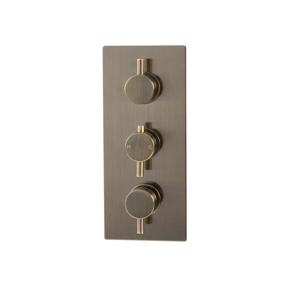 Deze thermostatische douchekraan heeft een schitterende geborsteld messing afwerking en een stijlvol hedendaags design. De drie gebruiksvriendelijke handvatten laten u moeiteloos de waterstroom en temperatuur regelen en deze douchekraan is ontworpen om water toe te voeren aan twee uitgangen zoals bijvoorbeeld een douchekop en een handdouche, en hij is voorzien van antiverbrandingstechnologie zodat u altijd verzekerd bent van een comfortabele en veilige douche-ervaring.