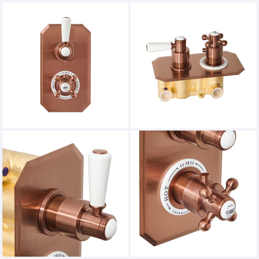 Deze inbouw douchekraan is vervaardigd van massief messing voor gegarandeerde duurzaamheid en heeft een mooie afwerking in satijn koper. Hij heeft een omstelkraan, zodat u moeiteloos tussen de twee uitgangen kunt schakelen en hij beschikt over thermostatische temperatuurregeling en anti-verbrandingstechnologie, zodat u elke keer verzekerd bent van een veilige en comfortabele douchebeurt.