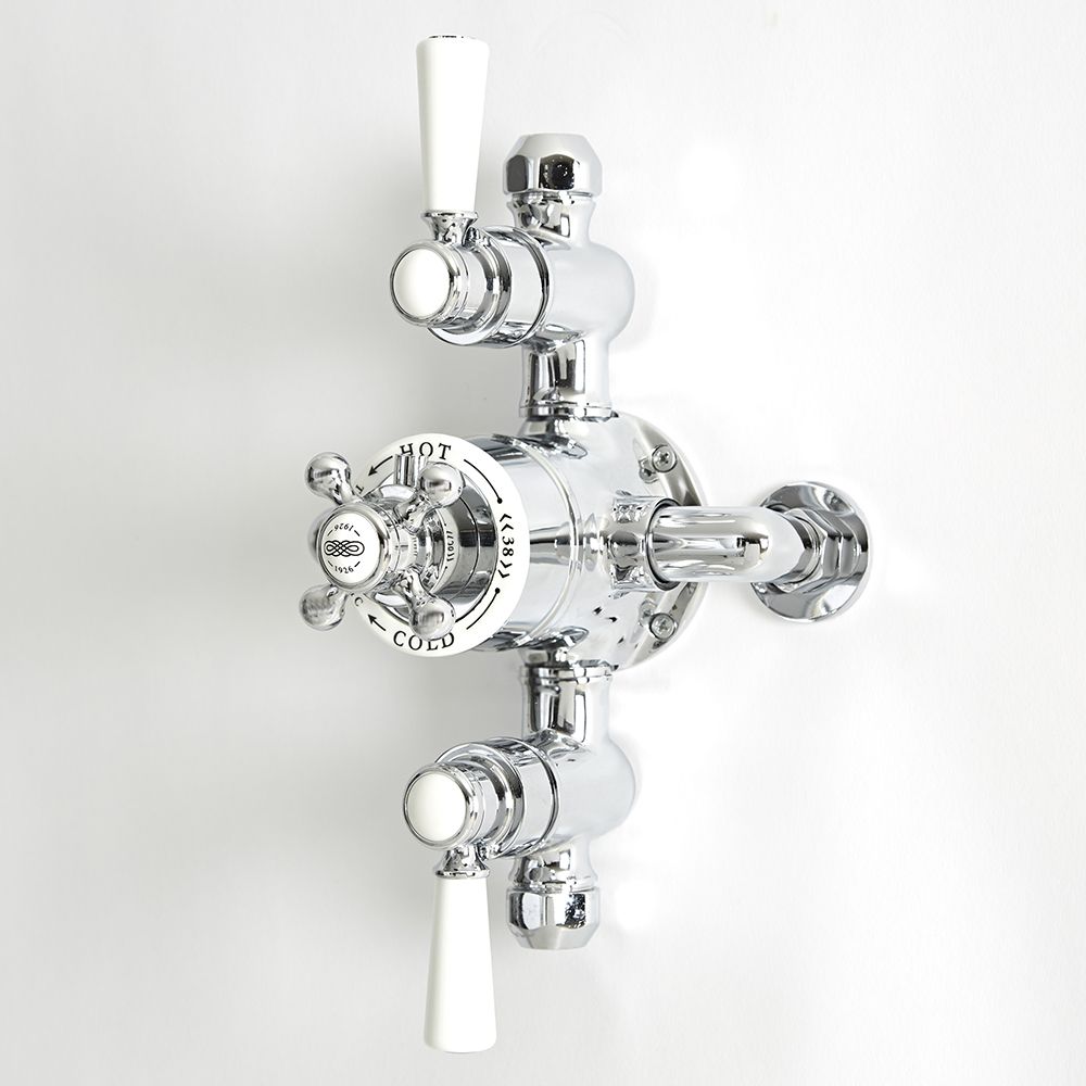 Deze Elizabeth 3-greeps 2-weg opbouw thermostatische douchekraan combineert een aantrekkelijke klassieke stijl en moderne technologie. U krijgt dus de voordelen van een moderne douchekraan terwijl u een mooie klassieke look toevoegt aan uw badkamer.