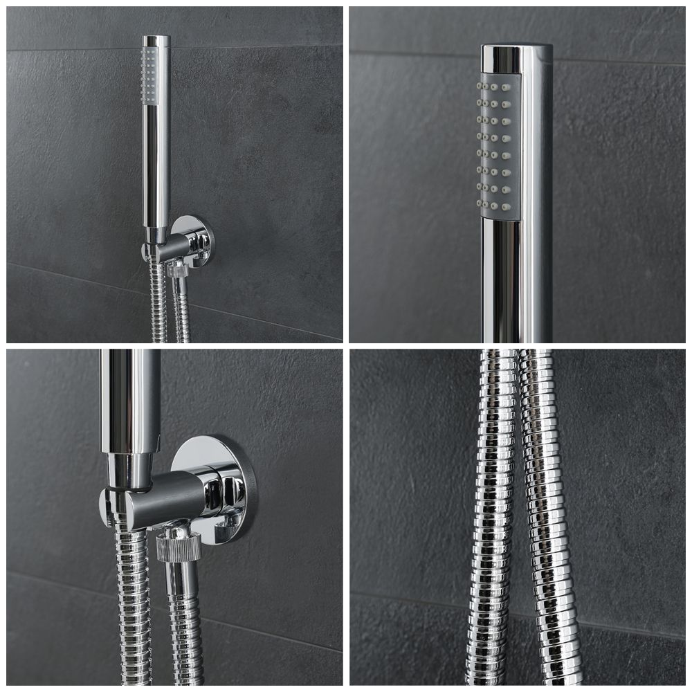 - Handdouche wordt geleverd met doucheslang en een aansluitbocht met handdouchehouder