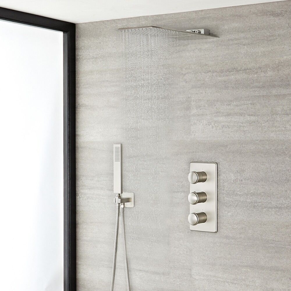 Upgrade uw badkamer en douche in stijl met deze geborsteld nikkel afgewerkte Aldwick doucheset, inclusief een 3-weg thermostatische inbouw douchekraan met omstel, een muurbevestigde douchekop met watervaleffect en een handdouche.