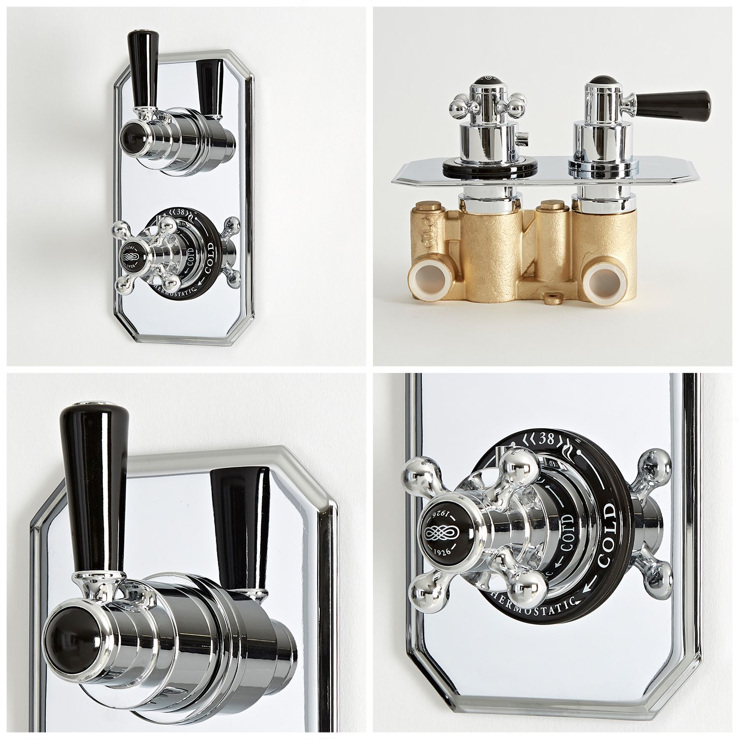 De thermostatische douchekraan is gemaakt van hoogwaardig massief messing met een duurzaam chromen afwerking en heeft een ingebouwde verbrandingsbeveiliging voor een comfortabele en veilige douche-ervaring elke keer. Zwarte keramische details voegen ook toe aan de klassieke look.