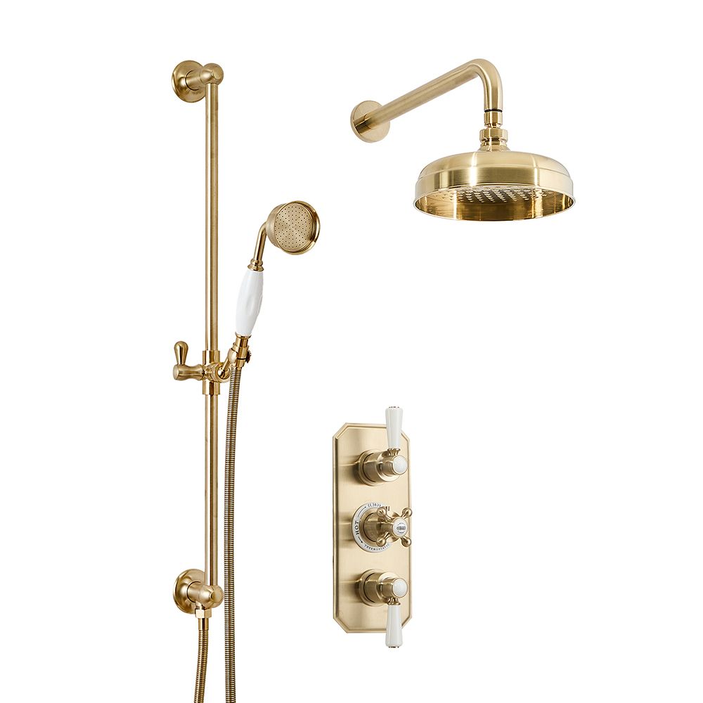 Deze prachtig ontworpen Elizabeth douche heeft een verbluffende afwerking in satijn goud en creëert een opvallende, klassieke look in elke badkamer. De doucheset bestaat uit een 2-weg thermostatische douchekraan, een 20,5cm ronde muurbevestigde douchekop, en een handdouche met glijstang.