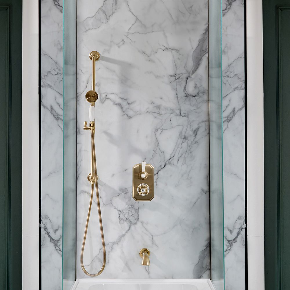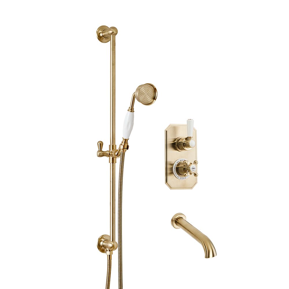 De mooi ontworpen Elizabeth douche heeft een tijdloos ontwerp met een prachtige afwerking in satijn goud en siert uw badkamer met klasse en elegantie. De doucheset bestaat uit een 2-weg thermostatische douchekraan, een handdouche met glijstang en een muurbevestigde baduitloop.