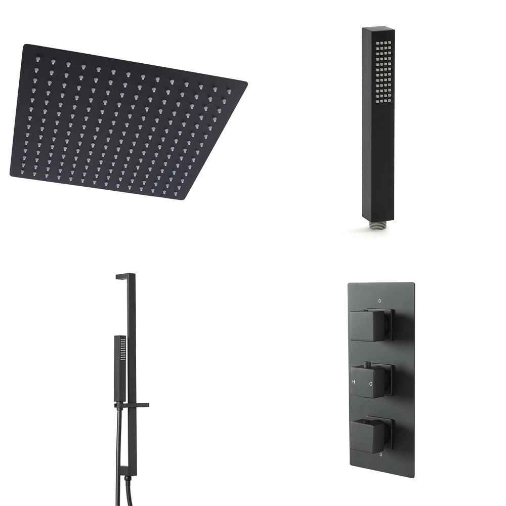 Voeg een opvallende, eigentijdse stijl toe aan uw badkamer met dit Preto matzwarte thermostatische douchesysteem, bestaande uit een 2-weg douchekraan, een 40cm vierkante verzonken plafond douchekop en een handdouche met glijstang.