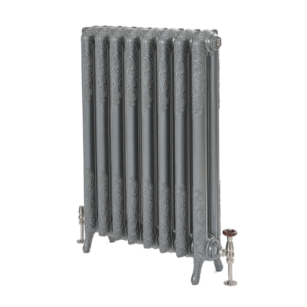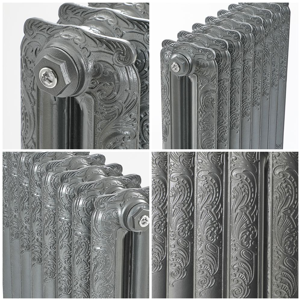 Deze prachtig ontworpen antiek zilver afgewerkte Charlotte gietijzeren radiator brengt klassieke elegantie in uw woning, Deze gietijzeren radiatoren hebben een uitstekende warmteafgifte en zijn voorzien van mooie decoratieve kolommen met een ingewikkeld bloemenmotief voor een ware stijlvolle traditionele look, De radiator heeft ook radiatorpoten die zorgen voor een veilige en stabiele installatie,