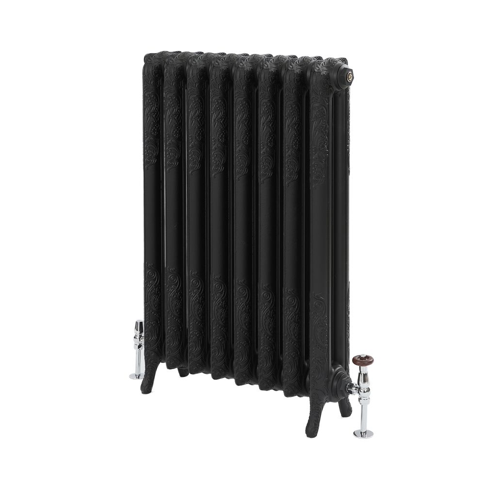 Deze unieke en zeer prachtig ontworpen leisteen zwart afgewerkte Charlotte gietijzeren radiator voegt een tijdloze elegantie toe aan elke woning, Deze gietijzeren radiatoren hebben een indrukwekkende warmteafgifte en zijn voorzien van mooie decoratieve kolommen met een ingewikkeld bloemenmotief voor een ware stijlvolle klassieke look, De radiator heeft een leisteen zwarten radiatorpoten zorgen voor een veilige en stabiele installatie,