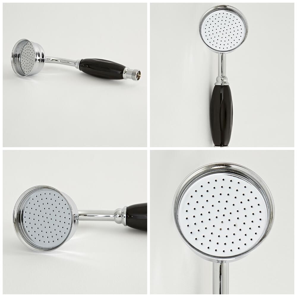 Gemaakt van duurzaam massief messing, geaccentueerd door een opvallende chromen afwerking met een ergonomische zwarte keramische handgreep, geeft deze handdouche een verfrissende waterstraal en een luxueuze douche-ervaring.