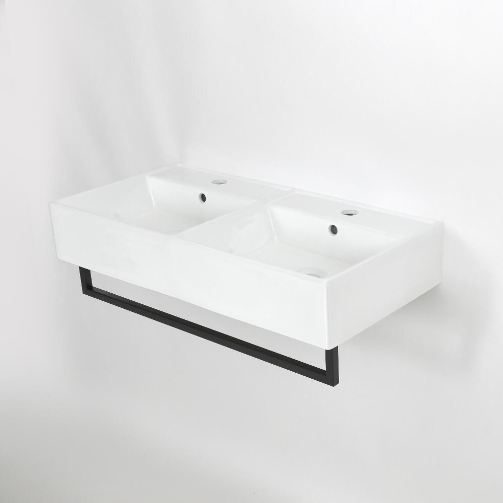 Hangende Dubbele Wastafel 82cm x 42cm (2 x 1 Kraangat) Wit met Zwart Handdoekrek | Sandford