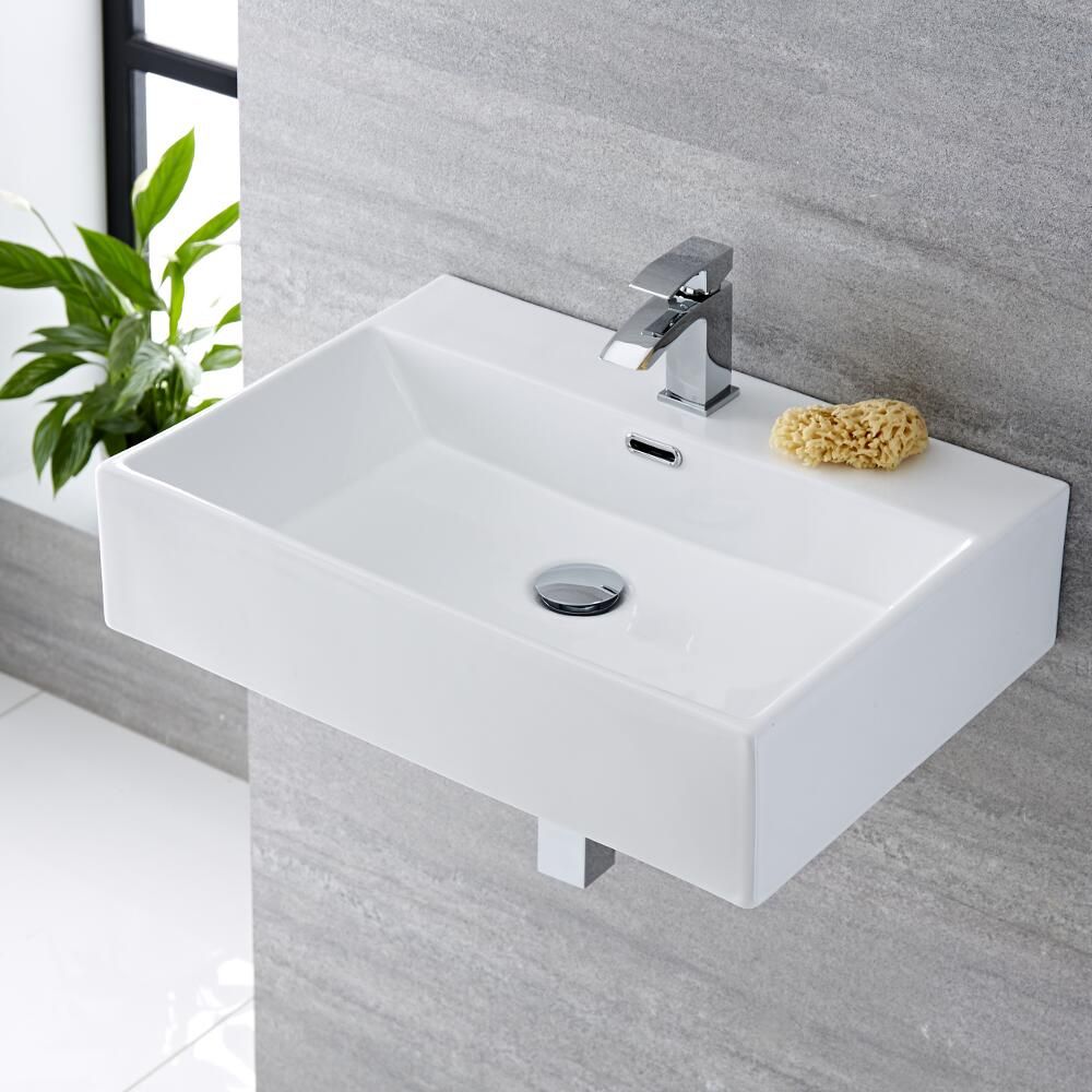 De wastafel is gemaakt van hoogwaardige keramiek met een slijtvaste witte glanzende geglazuurde afwerking die gemakkelijk schoon te maken is. Hi heeft een ruimtebesparend, muurgemonteerd ontwerp en met één voorgeboord kraangat is deze wastafel geschikt voor gebruik met al onze 1-gats wastafelkranen.