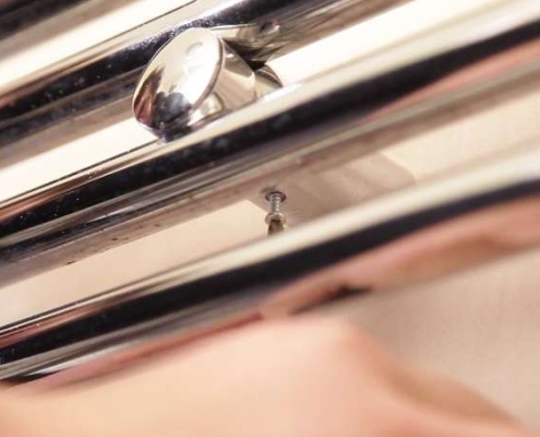 Draai de moer op de radiatorkraan nu los, zodat we de radiator kunnen afkoppelen. Zodra de radiator is afgekoppeld, moet je de radiator volledig leeg laten lopen. Zodra de radiator leeg is, moet je met de ontluchtingssleutel de radiator ontluchter opendraaien. Draai nu de moer van de andere radiatorkraan los en ontkoppel deze van de handdoekradiator. Je kunt nu de hele handdoekradiator van de muur halen. Zorg ervoor dat de radiator helemaal leeg is. Haal nu ook de bevestigingsbeugels volledige van de muur.