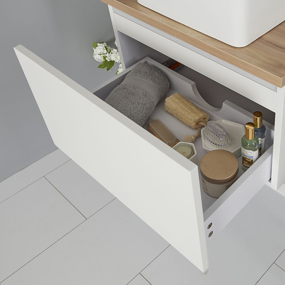 Dit moderne Newington badkamermeubel inclusief opzetwastafel heeft een witte afwerking maar een goud eiken werkblad. Het badkamermeubel heeft een druklade en wordt voorgemonteerd geleverd. Er is voldoende ruimte voor toiletartikelen en schoonheidsproducten. . Let op: kraan en afvoerplug niet meegeleverd.