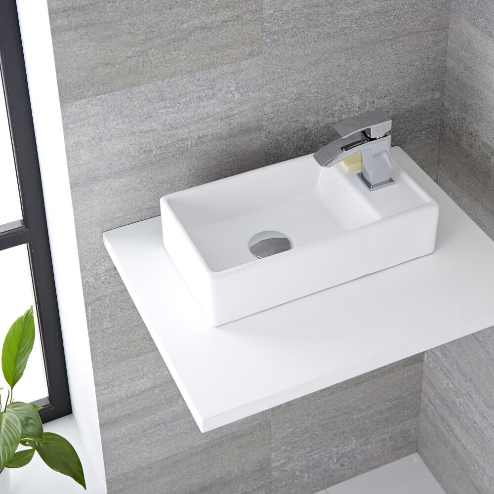 Deze Halwell 40cm x 22cm rechthoekige opzetwastafel heeft een stijlvol compact ontwerp en is ook ideaal voor gebruik in een kleinere badkamer, en suite badkamer of garderobe.