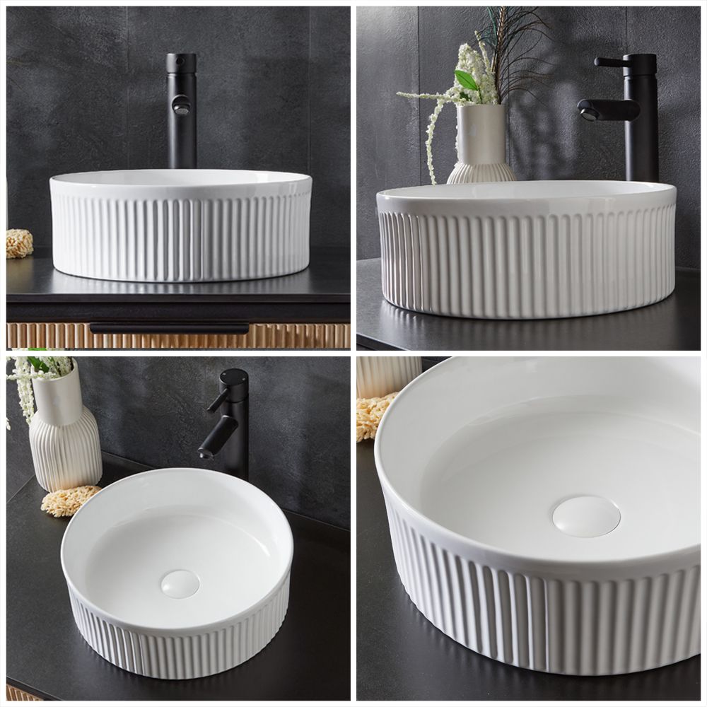 Creëer een verfijnde boetiekhotel stijl look met de Florence 37cm ronde, geribbelde opzetwastafel.