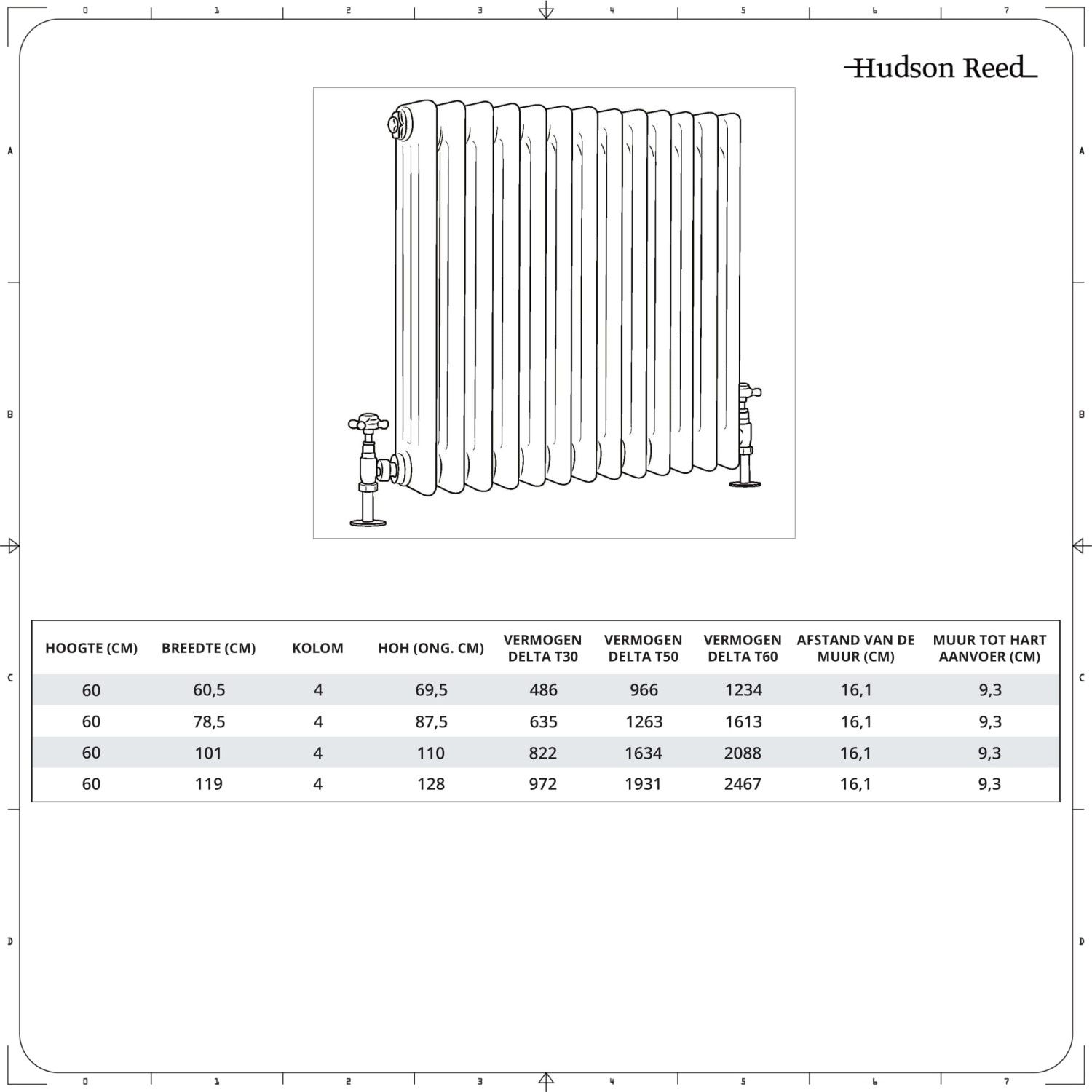 | HOH (cm) De HOH-afstand (hart-op-hart afstand) is de afstand tussen het midden van de watertoevoer- en de waterafvoerleiding. Deze afmeting is bij benadering en kan enigszins afwijken, afhankelijk van de radiatorkranen die worden gebruikt.