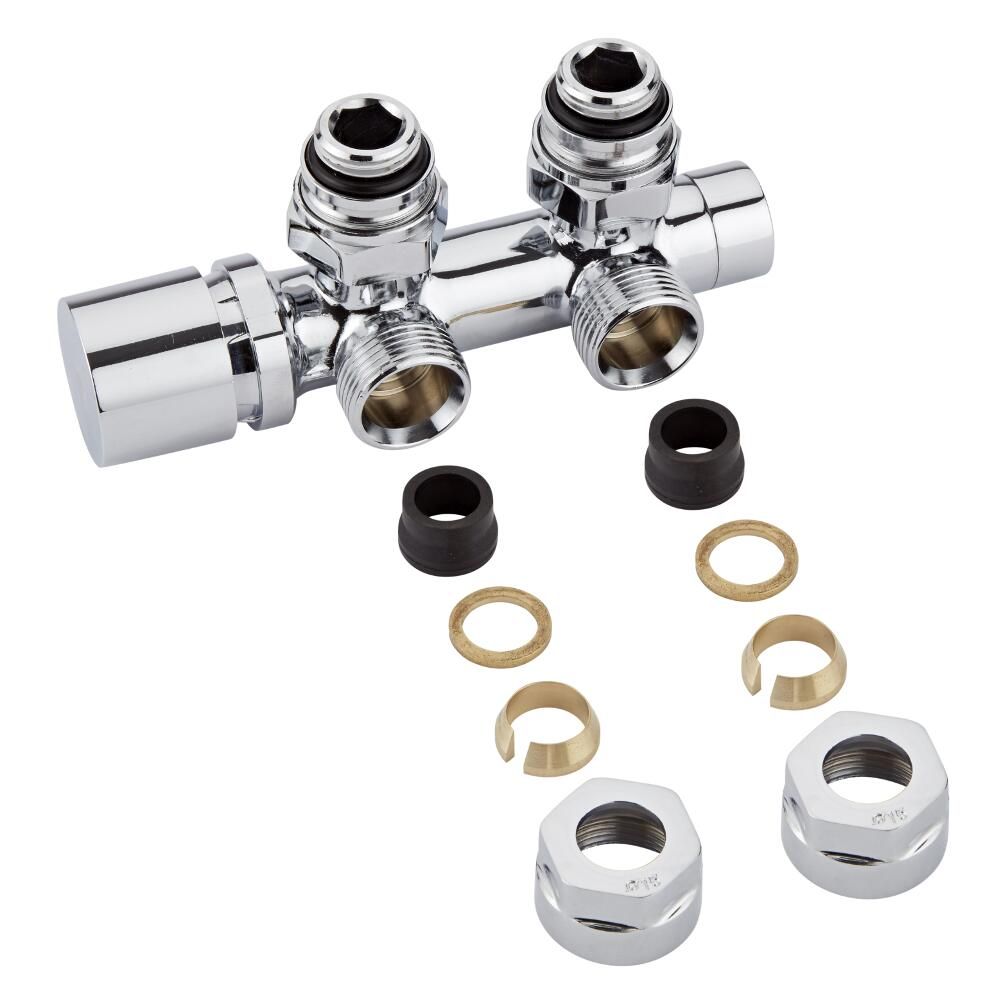 Radiatorkraan Onderblok Middenaansluiting Haaks Chroom met 15mm Adapters