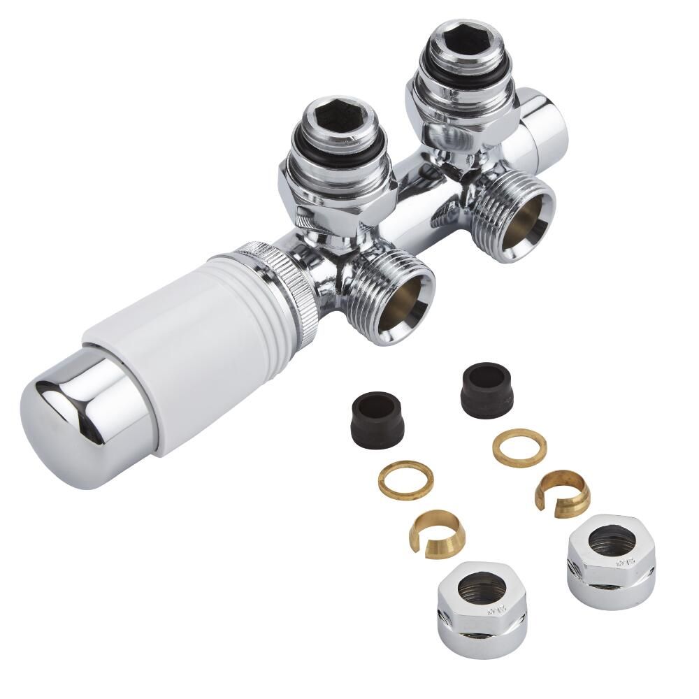 Radiatorkraan Thermostatisch Onderblok Middenaansluiting Haaks Chroom en Wit 15mm Adapters