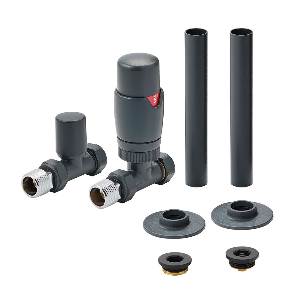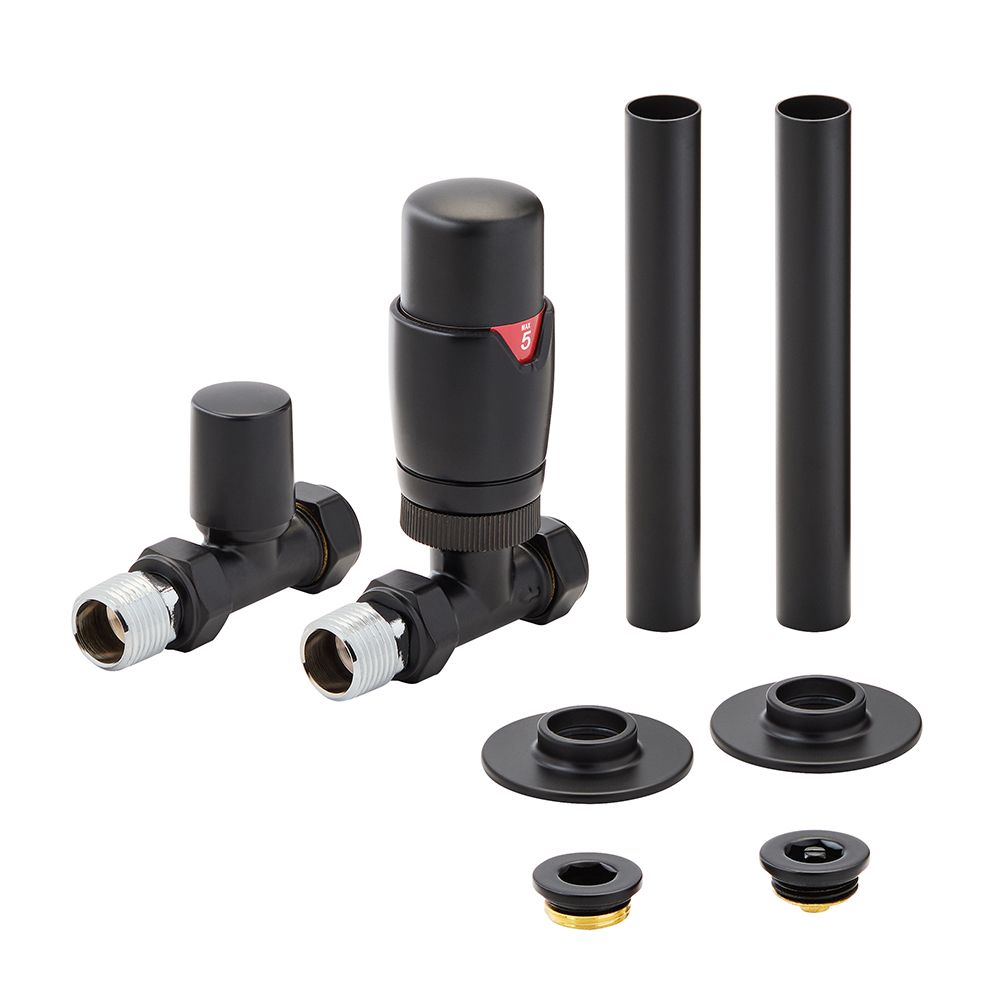 Voeg de laatse details aan uw radiator toe met deze set thermostatische rechte radiatorkranen en afdekbuizen.