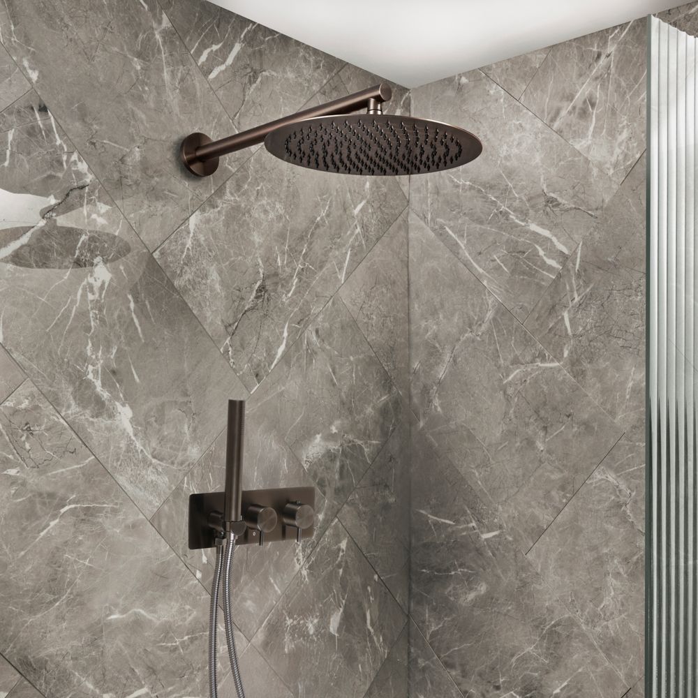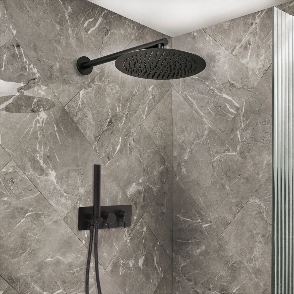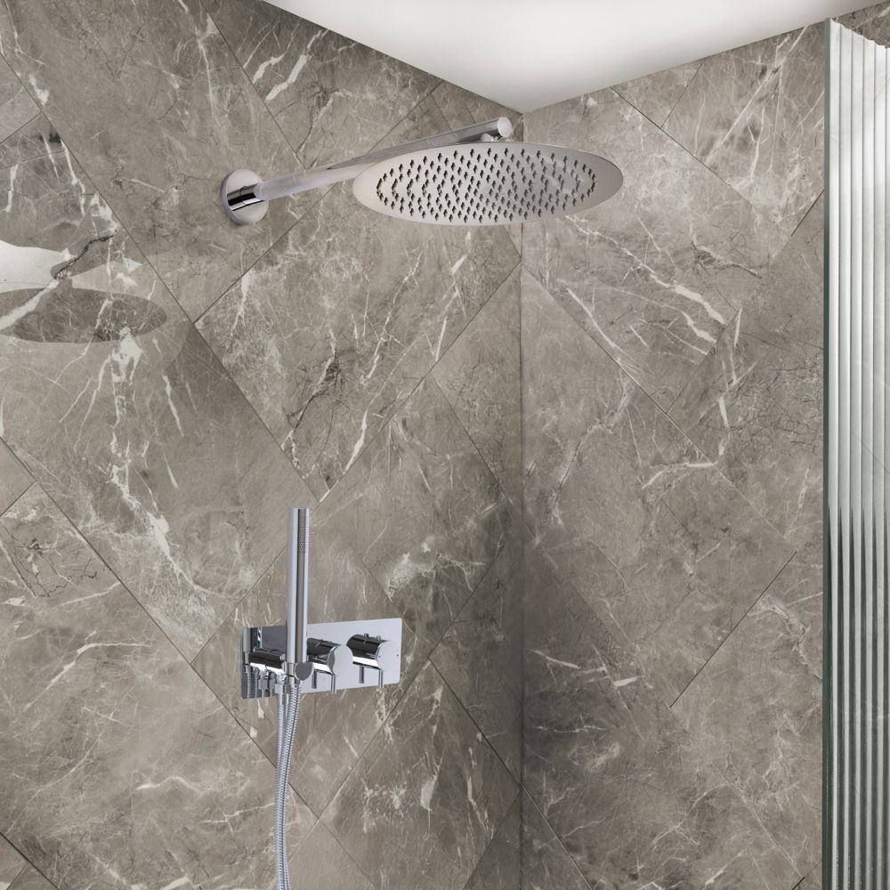 Breng een minimalistische, hedendaagse look in de badkamer en geniet van douchen in stijl met deze Otto-doucheset, bestaande uit een 2-weg thermostatische douchekraan met omstel, een regendouche en een handdouche.