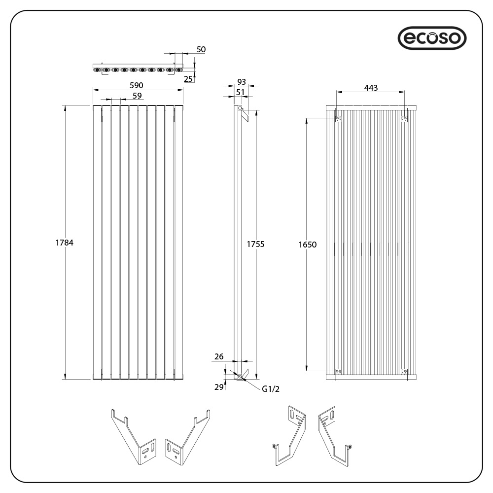 Vloeistofvrije Elektrische Design Radiator Verticaal Eenlagig 178,4cm x 59cm - Antraciet | Keuze WiFi Thermostaat | Revive Ardus - ECOSO van Hudson Reed
