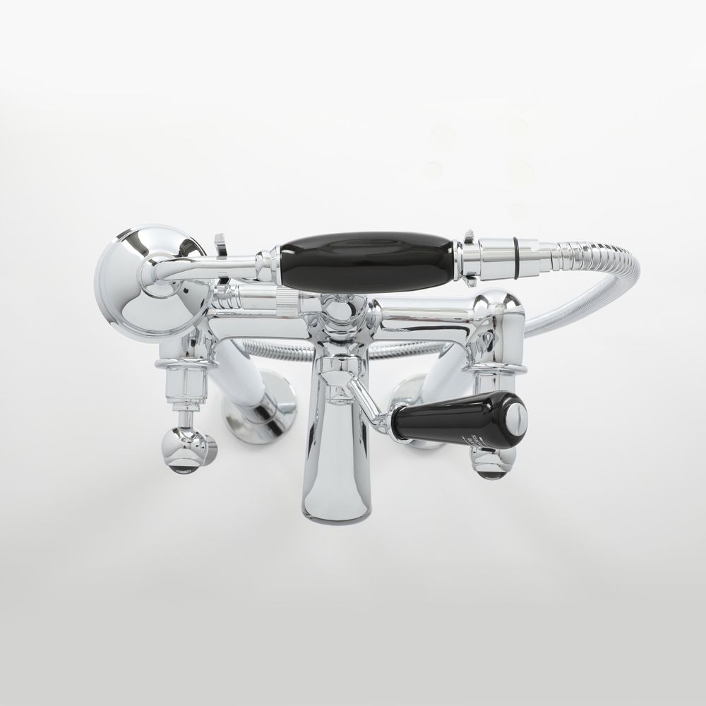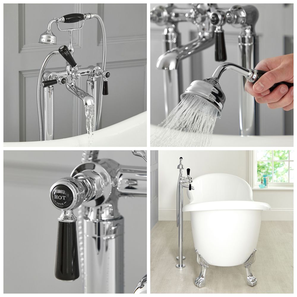 Deze Elizabeth vrijstaande badmengkraan met handdouche creëert klasse en stijl in elke badkamer en is perfect geschikt voor gebruik met onze traditionele vrijstaande baden. De kraan staat op aantrekkelijke chromen standpijpen om een echte klassieke look te creëren. Deze badmengkraan heeft zwarte keramische hendels waarmee u de waterstroom en temperatuur moeiteloos kunt regelen en de omstel laat u eenvoudig schakelen tussen de baduitloop en handdouche. Hij is vervaardigd van hoogwaardig massief messing voor gegarandeerde duurzaamheid, en heeft een prachtige chromen afwerking die goed past bij elk decor.