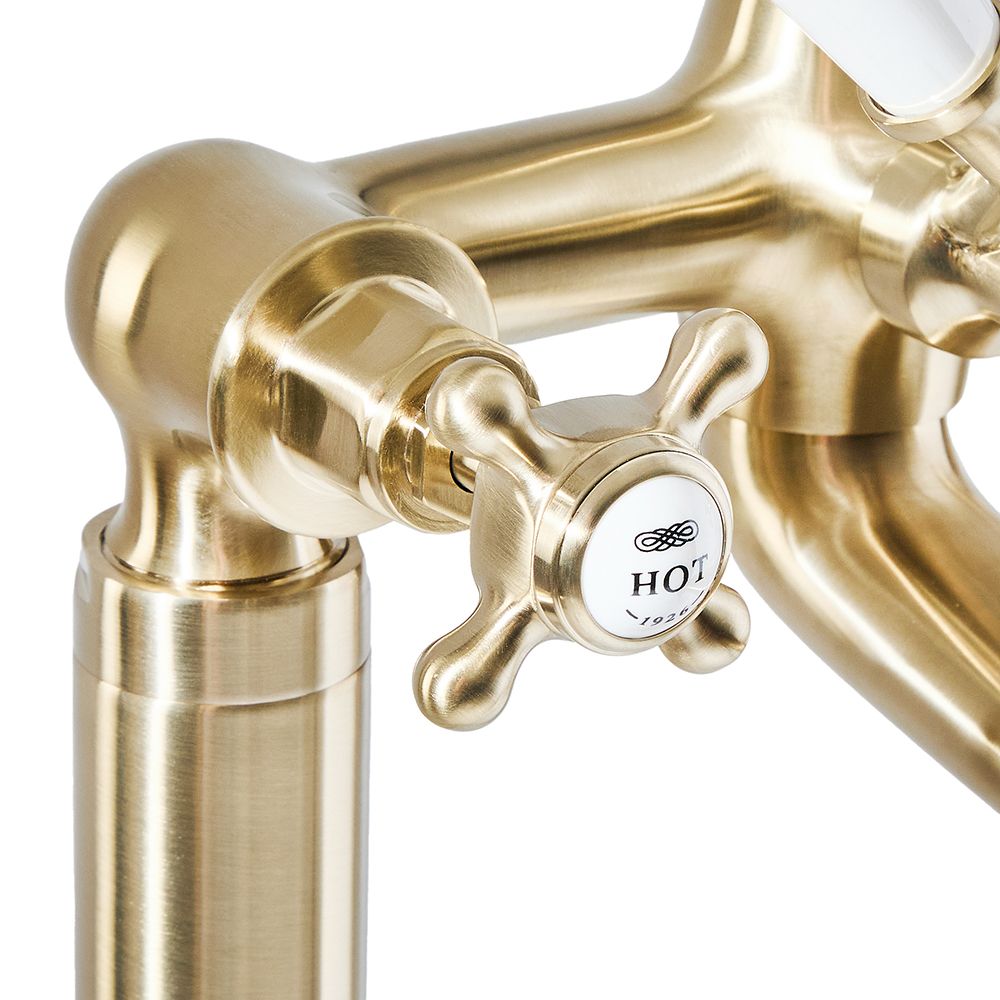Vervaardigd van massief messing met een slijtvaste afwerking in satijn goud, creëert deze vrijstaande badkraan een prachtige, stijlvolle look in de badkamer. Hij heeft een elegant ontwerp en is voorzien van kruisgrepen waarmee u moeiteloos de waterstroom en temperatuur kunt regelen.