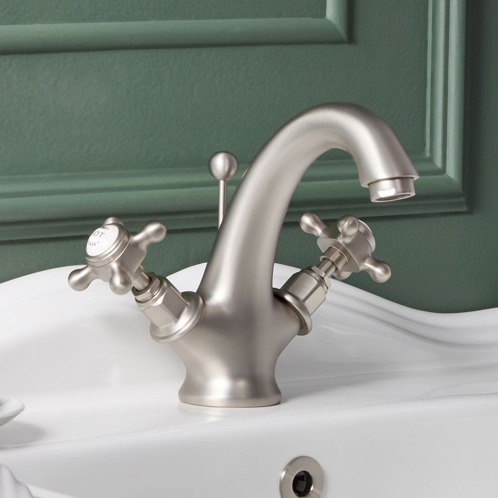 Deze prachtig ontworpen Elizabeth wastafelmengkraan heeft een stijlvol, klassiek ontwerp en voegt elegantie en klasse toe aan elke badkamer. Hij wordt geleverd met een pop-up afvoerplug die eenvoudig bediend kan worden met de trekstang aan de achterkant van de kraan. Deze wastafelkraan is vervaardigd van massief messing voor gegarandeerde duurzaamheid en een luxe gevoel en hij heeft twee traditionele kruiskop handvatten waarmee u moeiteloos de waterstroom kunt regelen. De kraan maakt ook gebruik van keramische schijftechnologie die lekken en druppels voorkomt.
